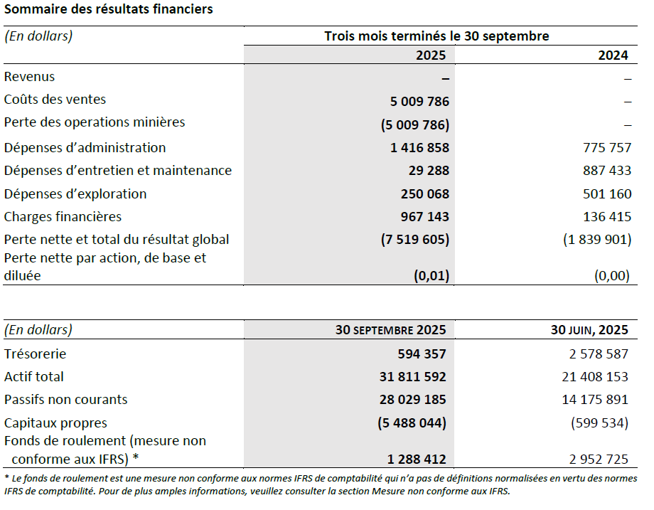 Rouyn-Noranda, Canada, 27 novembre, 2025 – Mines Abcourt Inc. (“Abcourt” ou la “Société”) (Bourse de croissance TSX: ABI) (OTCQB : ABMBF) annonce ses résultats financiers pour le premier trimestre terminé le 30 septembre 2025. Toutes les valeurs monétaires dans ce communiqué de presse sont exprimées en dollars canadiens. Les états financiers et le rapport de gestion sont disponibles sur SEDAR+.