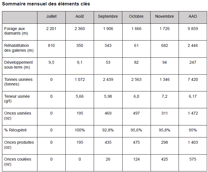 Abcourt a poursuivi le développement de ses chantiers et a continué les embauches en novembre. Comme prévu, Abcourt a ouvert un quatrième front de taille. La baisse de tonnage enregistrée en novembre s’explique par la séquence de développement de deux des quatre chantiers. C’était une étape obligatoire pour faire progresser les chantiers en toute sécurité, notamment en installant la ventilation dans le prochain sous-niveau dans un des chantiers.