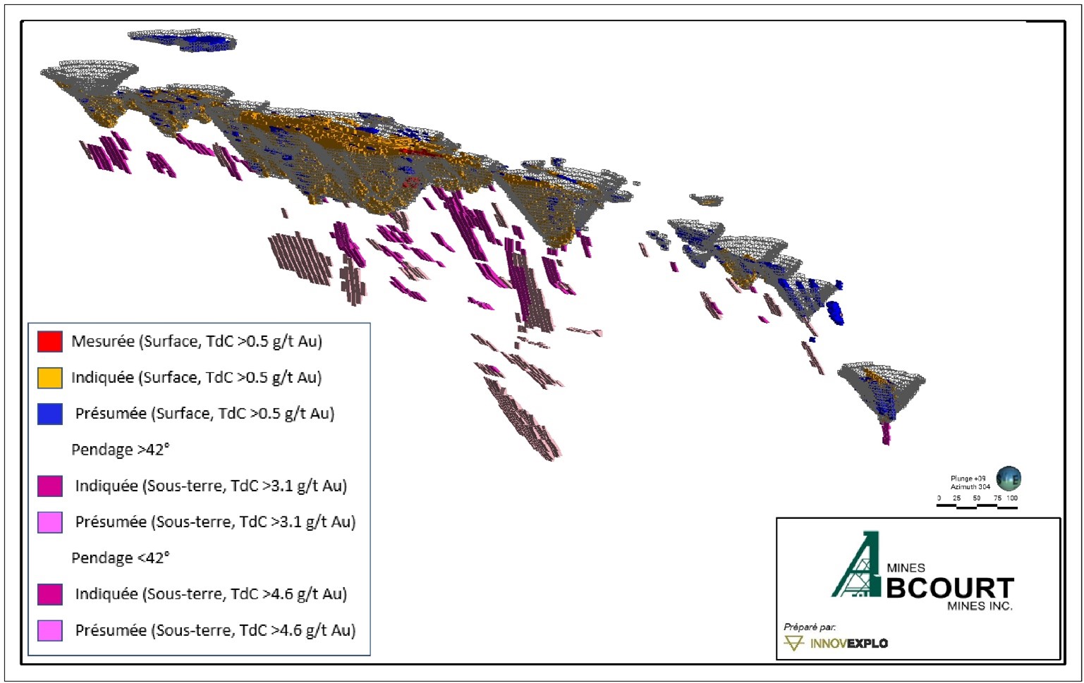 vii. L’exigence d’une perspective raisonnable d’extraction économique éventuelle est satisfaite en ayant des teneurs de coupure basée sur des paramètres raisonnables pour des scénarios potentiels d’extractions de surface et souterraines, des largeurs minimales et des volumes contraignants. L’estimation est présentée pour des scénarios souterrains potentiels (réalisé dans Deswik) sur une largeur de 1.7m pour des blocs de 16m de haut par 16m de long et à une teneur de coupure de 3.10 g/t Au pour la méthode de long-trous (LT) et de 4.60 g/t Au pour la méthode de chambres et piliers conventionnelle (CP). Les teneurs de coupure reflètent la géométrie et le pendage réel des enveloppes minéralisées. La fosse de l’estimé de ressource minérale de 2023 est contraint localement par une surface optimisée dans Whittle en utilisant une teneur de coupure arrondie de 0.5 g/t Au. Les teneurs de coupure reflètent la géométrie et le pendage réel des enveloppes minéralisées. Les teneurs de coupure ont été calculées en utilisant les paramètres suivants : une pente de 50° dans la roche et de 30° dans le mort-terrain, un coût minier en fosse = C$4.65/t, un coût minier sous-terrain de C$169.50/t pour le LT et de C$262.00/t pour le CP, un coût de transformation de C$21.50/t, des frais généraux et administratifs de C$12.00/t, des frais de vente de C$5.00/oz, un prix de l’or de 1 650 $ US l’once, un taux de change USD/CAD de 1,33 et un taux de récupération à l’usine de 91.7%. Les teneurs de coupure devraient être réévaluées à la lumière des conditions futures du marché (prix des métaux, taux de change, coût minier, etc.).