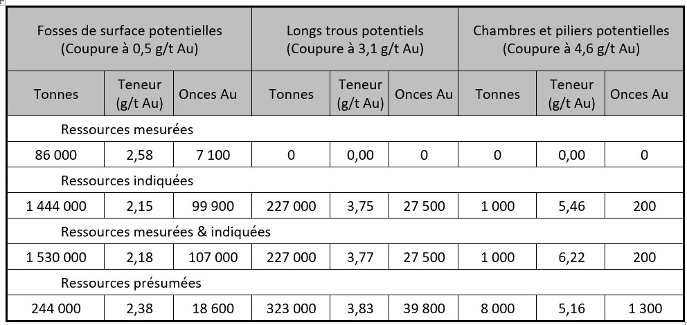 Tableau 1: Estimation des ressources minérales du Projet Aurifère Flordin