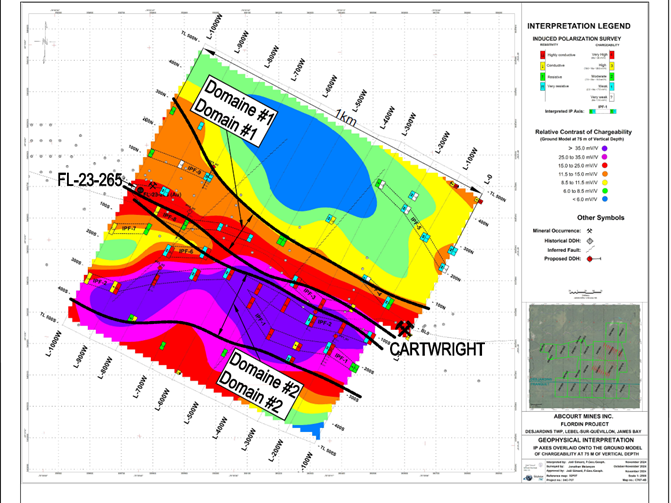 The first geophysical domain (Flordin gold trend) is continuous over one kilometre and clearly connects the recently stripped Cartwright zone to drilling completed in 2023, including hole FL-23-265 which intersected 14.79 g/t gold over 4 metres (press release dated January 30, 2024). This geophysical domain is characterized by a zone of high magnetism corresponding to the basalt hosting the Cameron Shear Zone. All along the baseline that connects the two sectors of interest, there is a thin anomalous horizon in chargeability and is within the limits of a more extensive resistive level likely to mark the presence of altered and silicified rocks. This type of geophysical signature is often characteristic of the gold-bearing shear zones found in the Abitibi. Historical drilling by NAP Quebec Mines Ltd. in this geophysical area has intersected high grades gold (5 to 10 g/t gold) and confirms the continuity of the mineralized zones contained between the Cartwright stripping and the 2023 drilling. Note that re-verification work on the old drill core available is currently underway. Consultation of old drill logs suggests that mineralized intersections are not properly analyzed. This new geophysical survey will allow us to better orient future drilling and maximize the results of these holes.