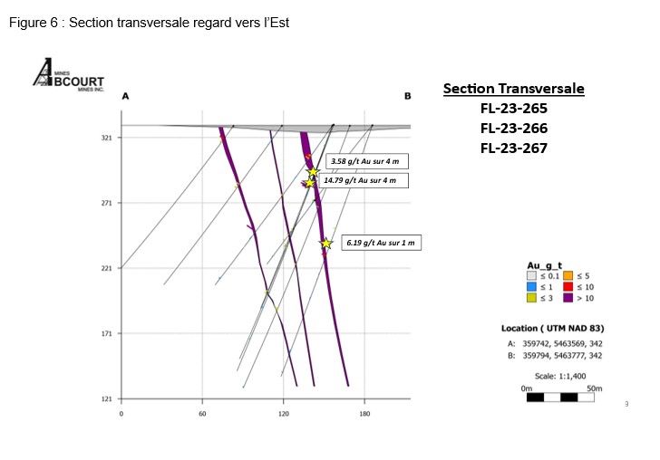 Confirmation of the lateral continuity of the mineralized zone is encouraging for future drilling at deeper depth. The high-grade gold intersection obtained in hole FL-23-265 is among the most significant ever reported on the Flordin Property with a metal factor of 59 (grade X thickness).