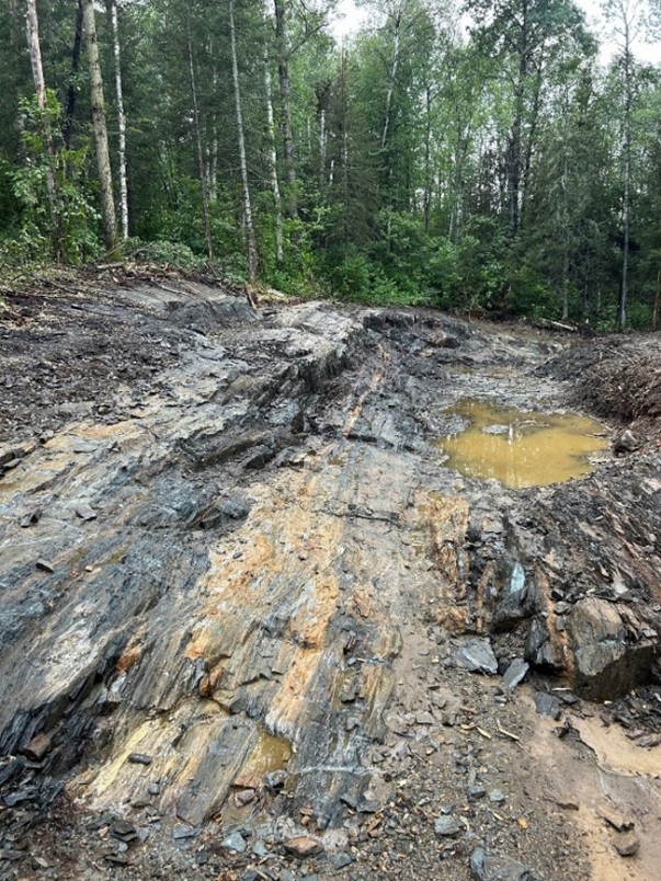 The main stripping is the No. 2, which exposes the mineralized zone over more than 50 metres in length. The mineralized zone has variations in thickness ranging from a few centimeters to several meters. The mineralization is characterized by pyrite-rich bands alternating with silicate-rich bands that may be red in color (hematization). Three new thin sections were collected and described by GEOX Consulting Inc., under the supervision of Lucie Mathieu (Ph.D., P.Geo.). Ms. Mathieu is a geologist specializing in metallogeny, structural geology and petrology. Her expertise has made it possible to characterize the mineralization typical of the Cartwright area. This new petrographic study shows that a significant amount of micrometre-sized gold grains, observable under a petrographic microscope, are observed in pyrite. This explains the high gold grades of 15, 7, 23, and 69.4 ppm Au for these samples.