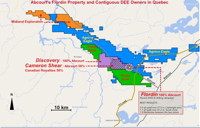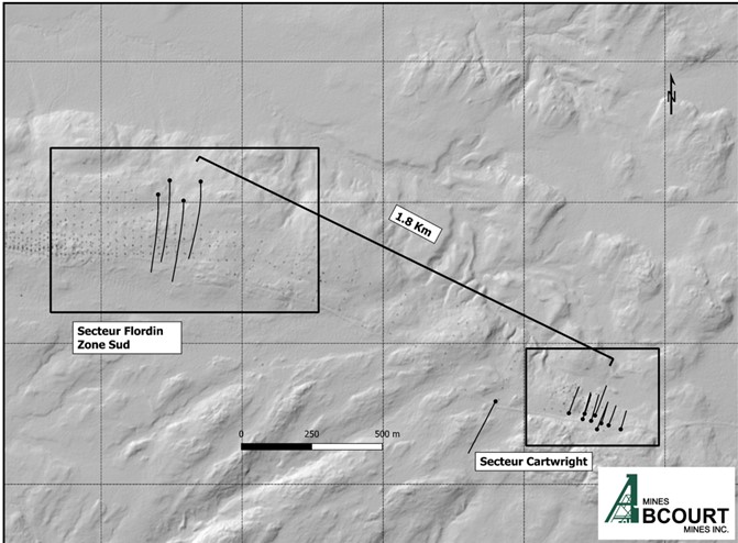 Rouyn-Noranda, Canada, May 12, 2025 – Abcourt Mines Inc. (“Abcourt” or the “Company”) (TSX Venture : ABI) (OTCQB : ABMBF) is pleased to announce the latest assay results from its 2025 drilling campaign on its Flordin property in the Lebel-Sur-Quévillon area. Hole FL-25-284 intersected 3.7 g/t gold over 11 metres including 11.0 g/t gold over 2.4 metres. The high-grade gold mineralized zone was intercepted less than 3 metres from surface directly below the Cartwright stripping. Note that the easternmost hole of the stripping (FL-25-277: 1.4 g/t gold over 13 metres) confirms that the Adam and Horse mineralized zones continue well beyond this one and therefore remains open to the East. The same is true for the westernmost hole (FL-25-286: 0.4 g/t gold over 16 metres) which also confirms that the mineralization is continuous and open in this direction.