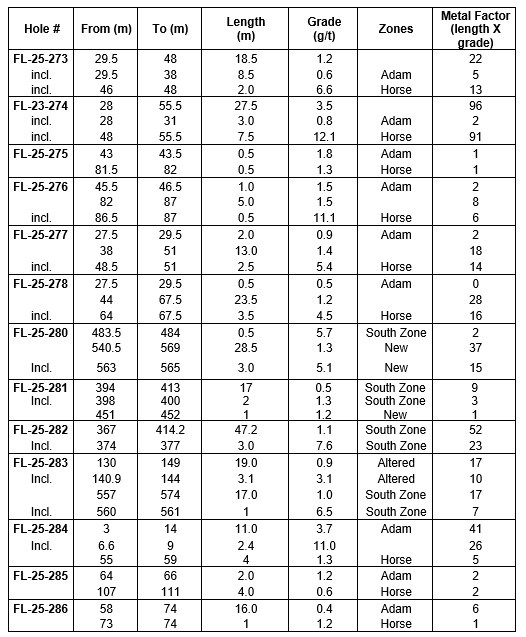 Objective 1: Confirm the continuity of gold mineralization directly below the Cartwright stripping completed in the fall of 2024. A total of nine (9) short holes for a total of 1227 metres were drilled in the Cartwright area. All the 2025 drillings carried out under stripping returned gold values over tens of metres in length. Hole FL-25-274 returned 3.5 g/t gold over 27.5 metres, including 12.1 g/t over 7.5 metres. Making this intersection one of the richest in gold in the project.