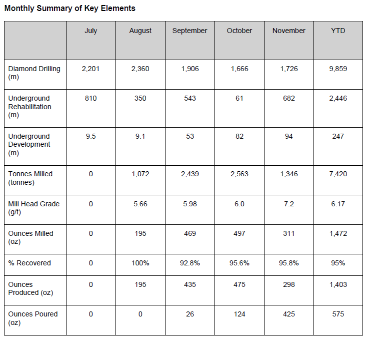 Abcourt advanced the development of its workplaces and continued hiring in November. Abcourt added a fourth mining front as planned. The lower tonnage in November was caused by development sequence in two of the four workplaces. It was a question of timing to safely advance the workplaces like advancing ventilation to the next sub-level in one of the workplaces.