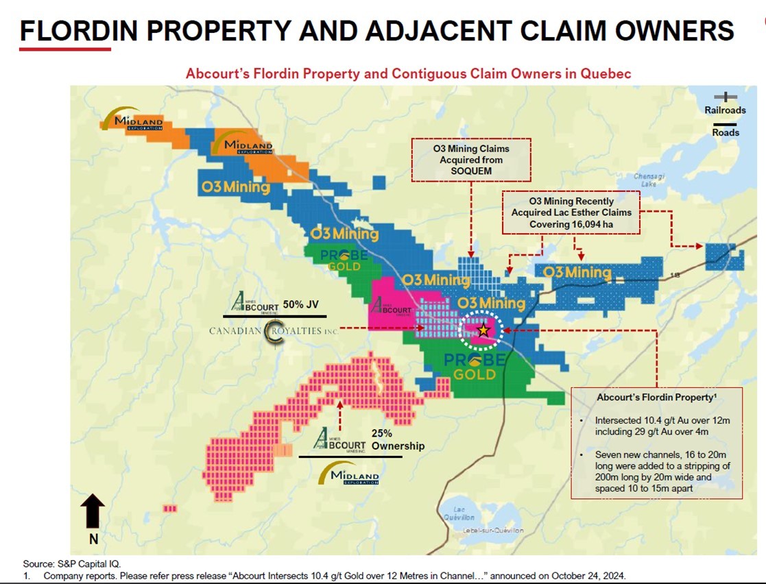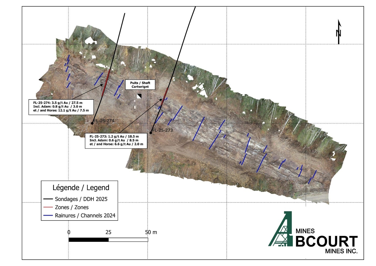 Pascal Hamelin, President and CEO comments: “The latest drilling results from the Cartwright stripping demonstrate the continuity of the Horse and Adam mineralized zones within a broad corridor of disseminated pyrites in basalt over 200 metres along strike. To date, we have completed only 804 metres of drilling directly under the trench. Planning is currently underway to add additional holes in this area that remains virtually unexplored to the east. Indeed, hole 277 is the only one that has been completed in this area. With a gold price approaching $3,000 per US ounce, the Flordin project, with convincing results so close to surface, remains a priority for Abcourt. Finally, we would like to welcome Agnico-Eagle to our Flordin-Cartwright sector. Last December, Agnico-Eagle announced the acquisition of O3 Mining, which holds mining titles and carries out exploration work in this area.”